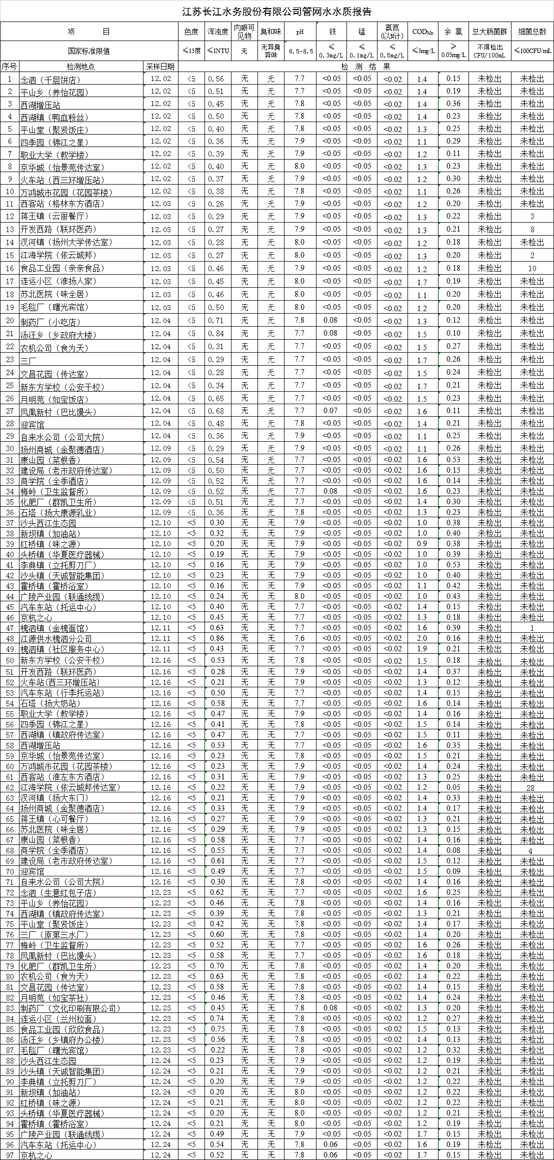 江蘇長江水務股份有限公司管網(wǎng)水水質報告(2019年12月)