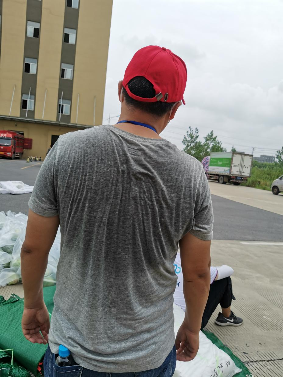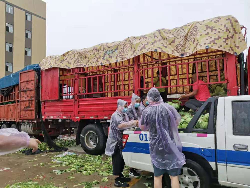 14:30,天空開始飄起雨點(diǎn),大家依舊堅(jiān)守在各自的崗位上,很快雨點(diǎn)就打濕了衣服和頭發(fā),可現(xiàn)場沒有一個人退下躲雨?!斑@車卸得差不多了,我們?nèi)ツ沁厧兔Α?,“邗江區(qū)轉(zhuǎn)運(yùn)蔬菜的車來了,需要10個人裝車”,“我去”“我也去”,現(xiàn)場只有時不時這樣的聲音傳來。