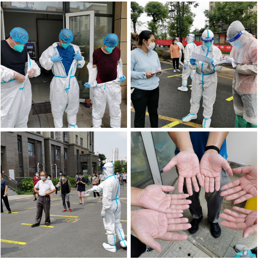 “幫我對(duì)照下防護(hù)服穿戴教學(xué)視頻,順序?qū)Σ粚?duì)?全部保護(hù)了沒有?”這是志愿者首次穿戴全套防護(hù)用具時(shí)忐忑的話語。初次接觸防護(hù)服,雖然前期教學(xué)培訓(xùn)過,但內(nèi)心期待中還有些許緊張,動(dòng)作生疏卻很仔細(xì),大家相互幫忙、相互學(xué)習(xí)、相互監(jiān)督,確保不留任何漏洞,檢測(cè)過程中,大家要做好測(cè)量體溫、核對(duì)人員信息、核查健康碼、提醒保持安全距離、幫助老弱病殘及特殊人群等工作,有時(shí)還要應(yīng)對(duì)暈厥的居民、易怒的群眾情緒以及少部分特殊群體的交流障礙,一次核酸檢測(cè)的時(shí)間大概在3小時(shí)左右,這樣高強(qiáng)度的工作環(huán)境,大家沒有任何怨言,除去防護(hù)服的那一刻,看著臉上深深的勒痕、滴水的上衣和發(fā)白的雙手,有的只是相視一笑,再次投身到小區(qū)封控管理工作中去。