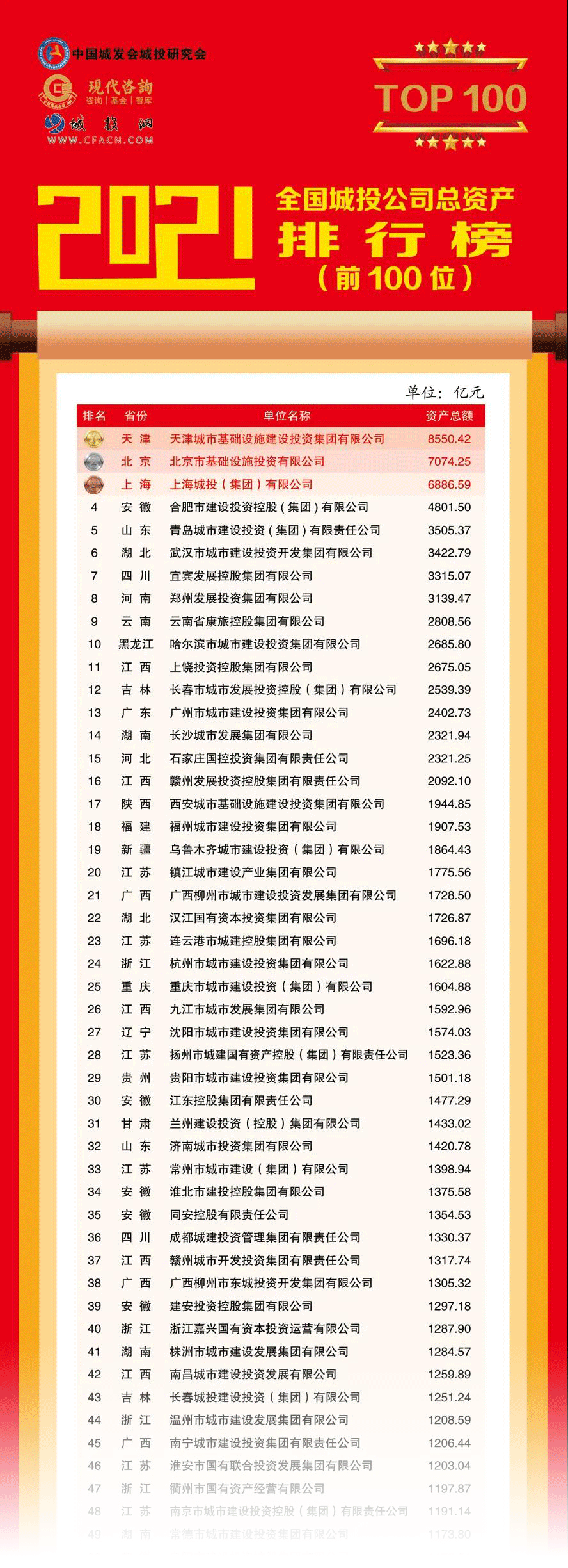 該排行榜由中國城市發(fā)展研究會城市建設(shè)投融資研究專業(yè)委員會(簡稱”中國城發(fā)會城投研究會”)、江蘇現(xiàn)代資產(chǎn)投資管理顧問有限公司(簡稱“現(xiàn)代咨詢”)和城投網(wǎng)聯(lián)合發(fā)布,迄今已連續(xù)發(fā)布8年,主要反映全國城投公司規(guī)模變化的總資產(chǎn)排名情況,目前已成為全國城投行業(yè)群體發(fā)展?fàn)顩r和城投轉(zhuǎn)型升級的權(quán)威發(fā)布。