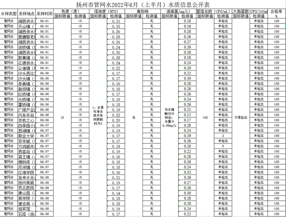 揚州市管網(wǎng)水2022年6月(上半月)水質(zhì)信息公開表