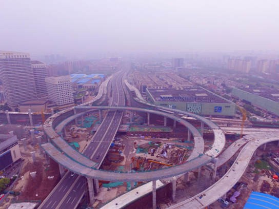 潤揚(yáng)路快速化改造工程(潤揚(yáng)路-江陽路互通立交)鋼箱梁共計(jì)9聯(lián),包括主線1聯(lián),匝道8聯(lián),全長904米,重達(dá)5464噸。其中主線鋼箱梁下穿揚(yáng)州南部快速通道,8聯(lián)匝道鋼箱梁高低跌錯(cuò),與現(xiàn)澆箱梁完美結(jié)合,形成渦輪型互通立交。全橋鋼箱梁分為65個(gè)節(jié)段進(jìn)行吊裝,本次吊裝的最后一段鋼箱梁長16.7米、寬3.31米、高0.84米、重20噸。