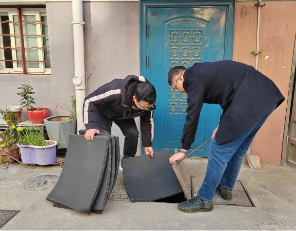 在社區(qū)負(fù)責(zé)人的協(xié)助下,黨員們迅速分組,攜帶專業(yè)工具和保溫棉材料,分赴各個樓棟給水表箱“穿衣蓋被”。黨員們以身作則,不畏嚴(yán)寒,手持保溫棉細(xì)心鋪設(shè)在每一個井蓋里,確保每一處細(xì)節(jié)都不遺漏。