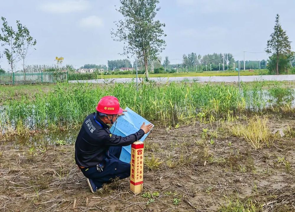 今年7月盛夏,韋煒一如既往例行巡線,途中行至沙頭門站,發(fā)現(xiàn)向東約50米處一小河塘正施工開挖擴建。他立即想起原較淺小河塘下面有一根中壓PE315運行燃氣管道,控制著李典鎮(zhèn)、頭橋鎮(zhèn)氣源,且河塘兩側均有燃氣管線標識樁,河塘施工前并未收到管線對接通知。韋煒第一時間向部門領導匯報現(xiàn)場情況,隨后走訪群眾尋找到河塘主人和所屬村村委會進行交涉。